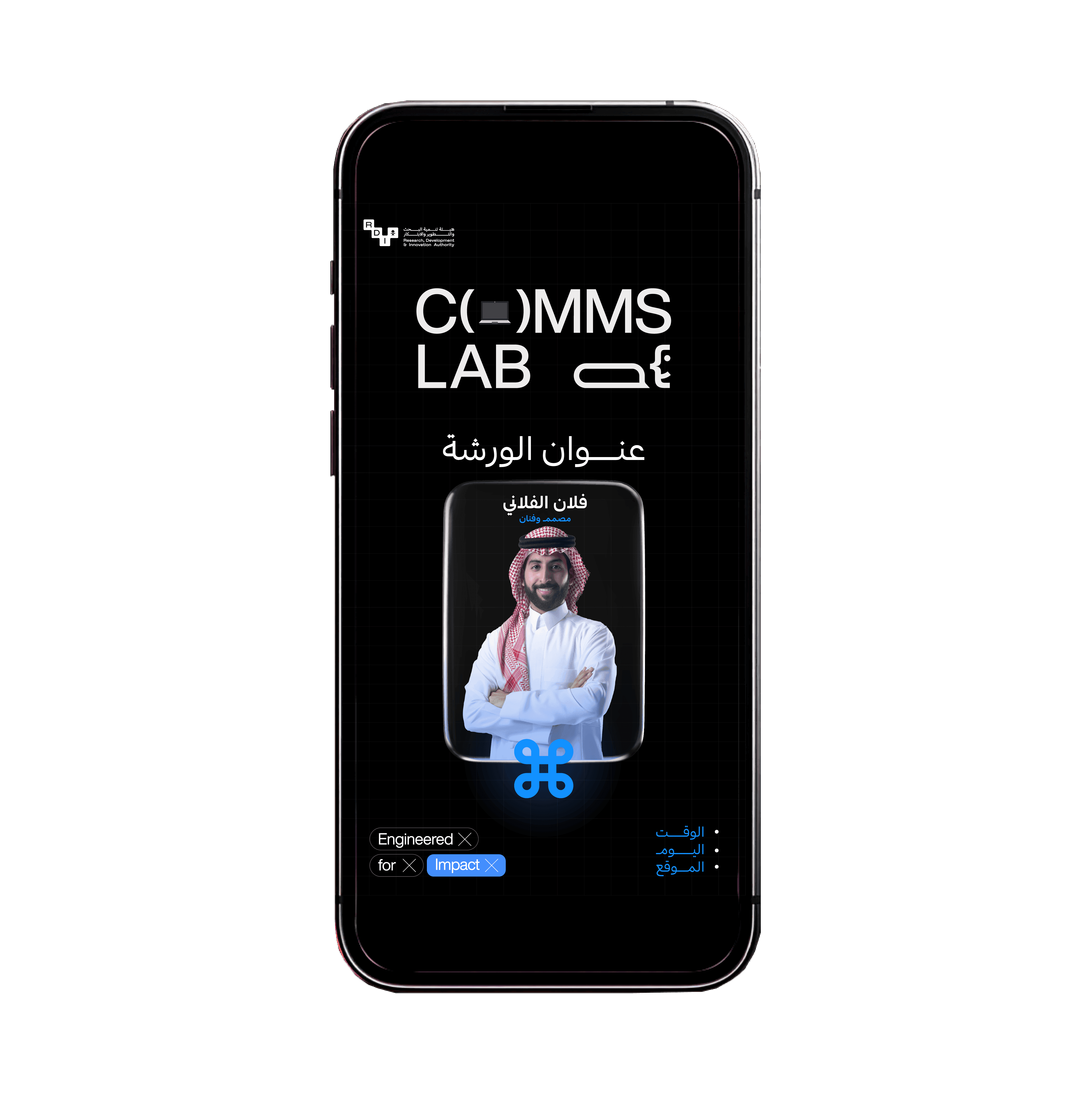 Developed the full brand identity for Comms Lab, a monthly workshop series connecting communication professionals across Saudi Arabia's digital economy, space, and innovation ecosystem. The centerpiece of the identity is an adaptive logo system — the C(O)MMS mark uses parentheses as a dynamic container, swapping the inner element to reflect each workshop guest's field or interest. One structure, multiple expressions. Delivered under a sharp brand philosophy: Clear. Direct. No hype.